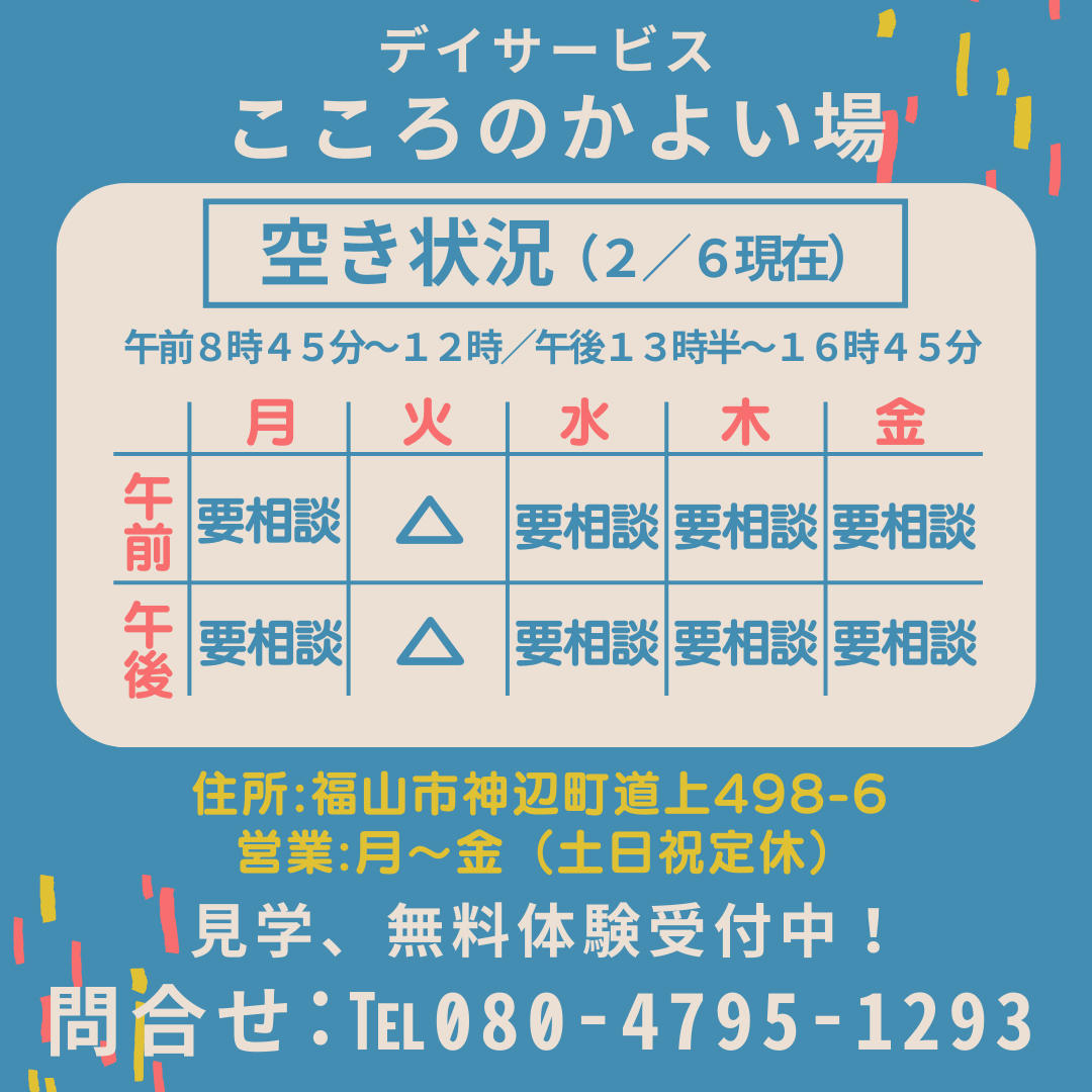 デイサービス「こころのかよい場」の空き情報です。状況が変わっている場合もありますので、下画像を参考にご検討いただき、ご相談・お問い合わせください。