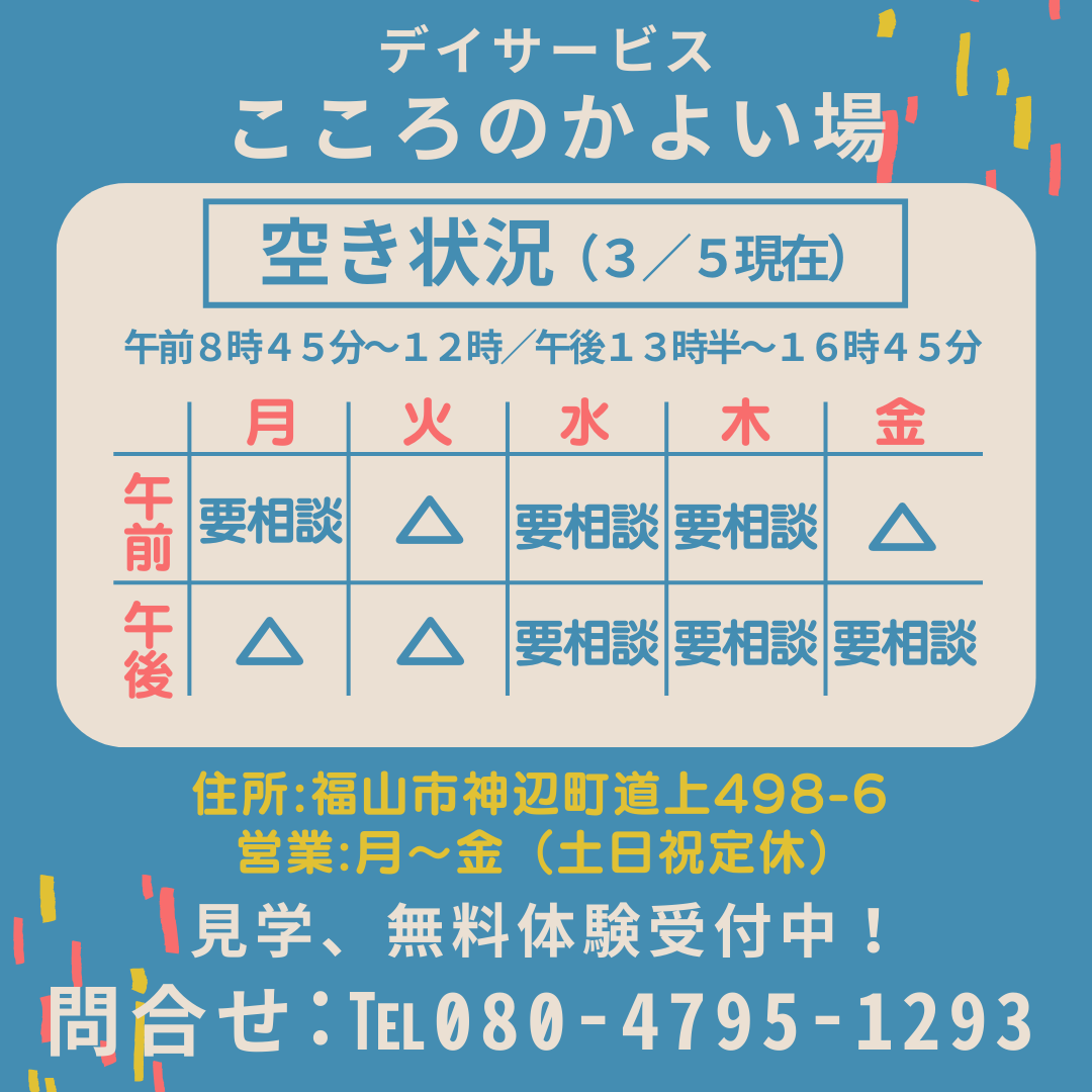 デイサービス「こころのかよい場」の空き情報です。状況が変わっている場合もありますので、下画像を参考にご検討いただき、ご相談・お問い合わせください。