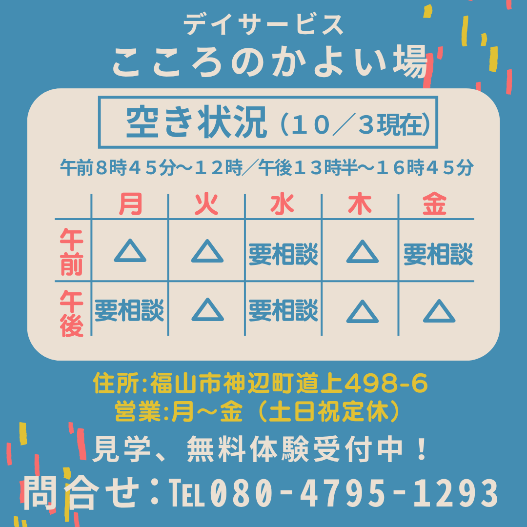 デイサービス「こころのかよい場」の空き情報です。状況が変わっている場合もありますので、下画像を参考にご検討いただき、ご相談・お問い合わせください。