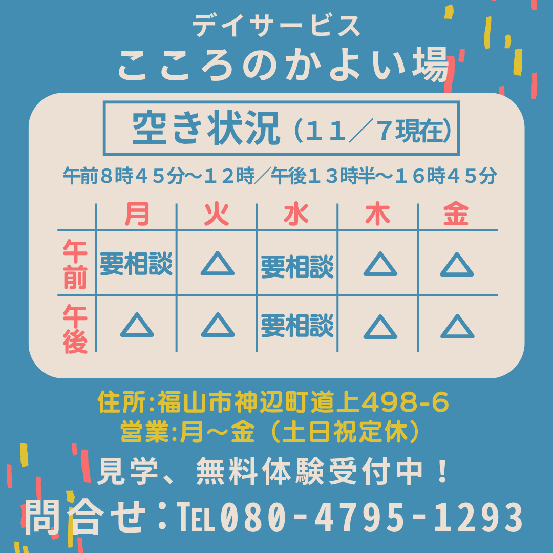 デイサービス「こころのかよい場」の空き情報です。状況が変わっている場合もありますので、下画像を参考にご検討いただき、ご相談・お問い合わせください。